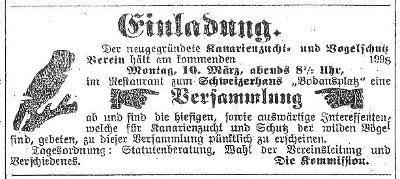 Der Verein wurde 1913 unter dem Namen Kanarien- und Vogelschutzverein Konstanz gegründet und trat dem „Bund badischer Vereine für Kanarienzucht und Vogelschutz" bei. Der Monatsbeitrag betrug 35 Pfennig. Schon im Gründungsjahr fand die erste Ausstellung mit Prämierung statt. Nach Abzug aller Kosten wurde ein Gewinn von 3,25 Mark verbucht.